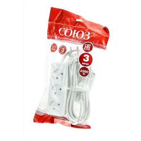Удлинитель СОЮЗ 10А 3м белый трехместный без заземления