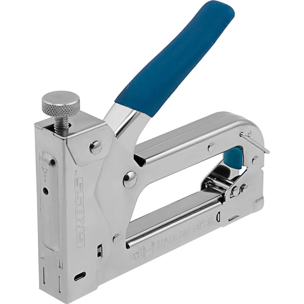 Регулируемый мебельный степлер со стальным корпусом совместим со скобами типа 53 размером 4-14 мм и используется для крепежных работ с листовыми материалами из фанеры, картона, ДВП, ДСП, оргалита, а также с пленкой и теплоизоляционными материалами. Винтовой регулятор позволяет плавно изменять силу удара, что удобно для работы с длинными скобами и твердыми материалами. Инструмент будет полезен при сборке и обивке мебели, укладке ковровых покрытий, проведении ремонтных и отделочных работ.