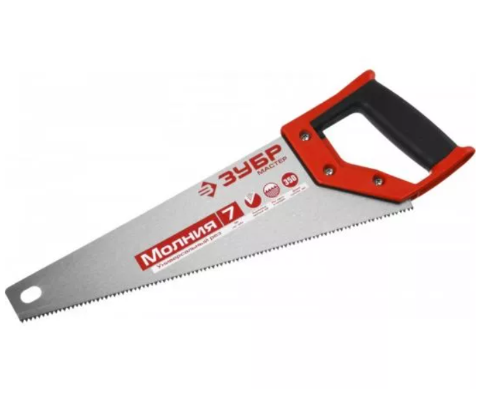 Ножовка по дереву ЗУБР МОЛНИЯ-7 применяется для продольного и поперечного распила древесины, средних заготовок, фанеры, ДСП, МДФ. Двухкомпонентная эргономичная рукоятка. Импульсная закалка каждого зуба: высокая твердость и предотвращение выкрашивания. Утолщенное полотно из высококачественной стали У8А для идеально прямого реза.