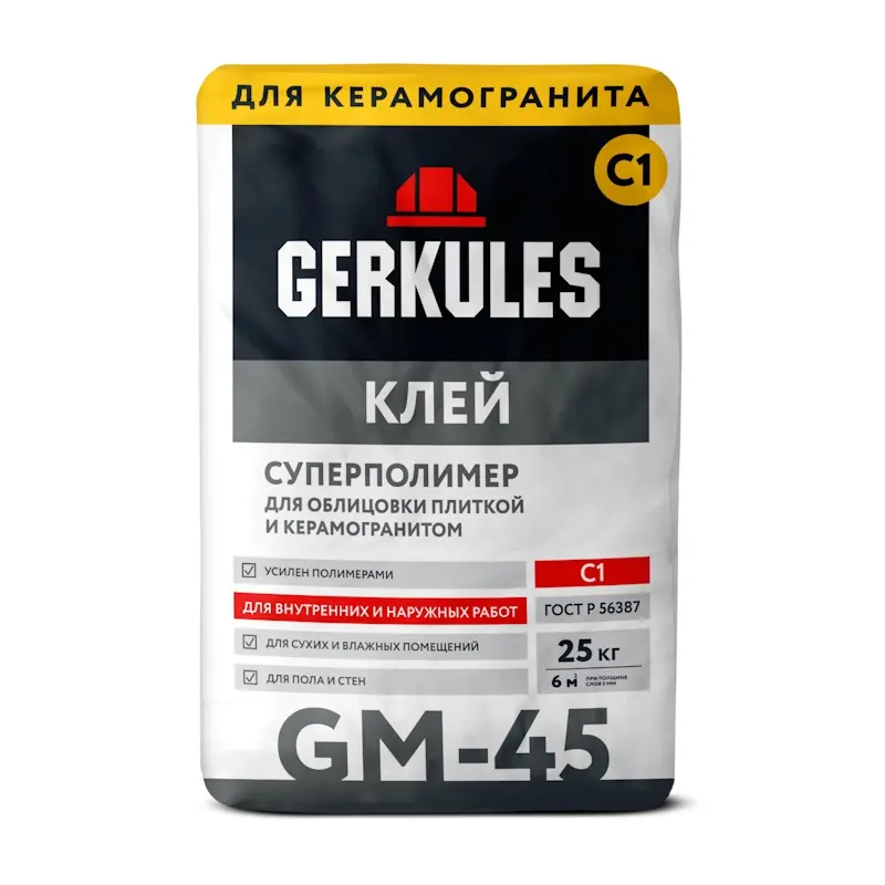 Клей для плитки Gerkules GM-45 Суперполимер — модифицированная клеевая смесь на цементной основе применяется для укладки на стены и пол керамогранита внутри и снаружи помещений, а также керамической плитки и мозаики внутри помещений. Для помещений с любым уровнем влажности. Рекомендованный размер керамогранита до 30х30 см, керамической плитки до 60х60 см.