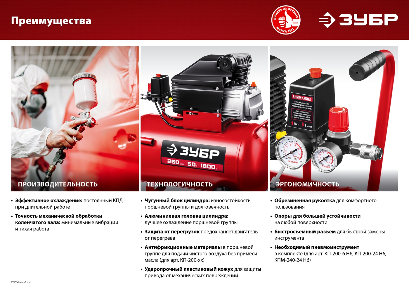 Качественное и надежное переносное оборудование для периодических работ дома, на даче, в небольшой мастерской, а так же для регулярной очистки от пыли офисной и бытовой техники . Безмасляный компрессор - это чистый, без примесей масла, воздух на выходе. В комплект входит набор пневмоинструментов для проведения широкого спектра работ. При правильной эксплуатации ресурс данных компрессоров составляет не менее 1000 часов*. * на основании результатов испытаний лаборатории компании АО «ЗУБР ОВК»
