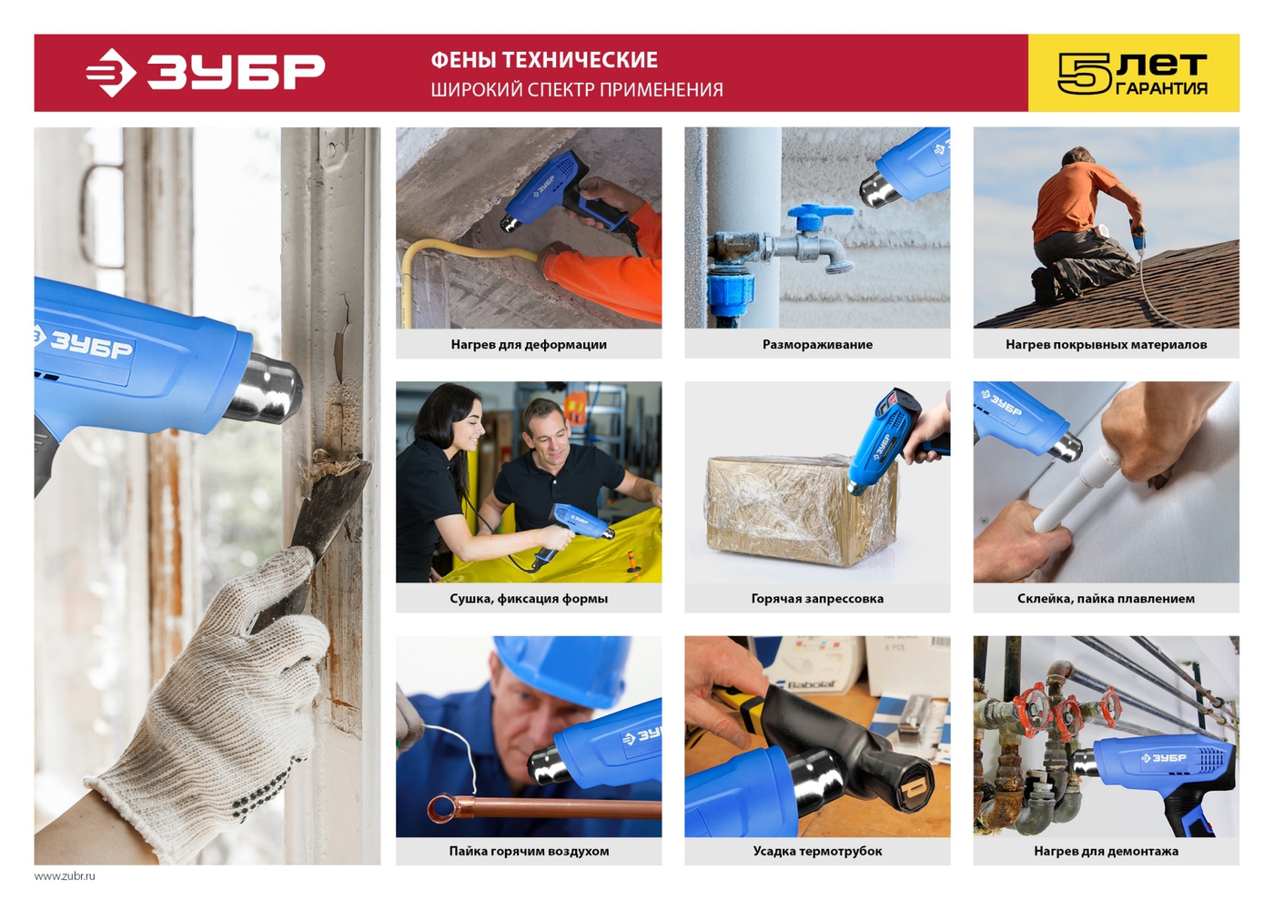 Для генерации горячего воздуха. Используется: при сушке и/или снятии лакокрасочных покрытий, сушки клеевых соединений и/или клейки путем нагрева, сушки штукатурки, шпатлевки, изделий из гипса и аналогичных материалов, монтажа окантовок, трубок и проч. методом горячей усадки, посадки с нагревом, горячей деформации, размораживания труб, разъема резьбовых соединений, сушки влаги, пайки, лужения, дезинфекции и т. д.