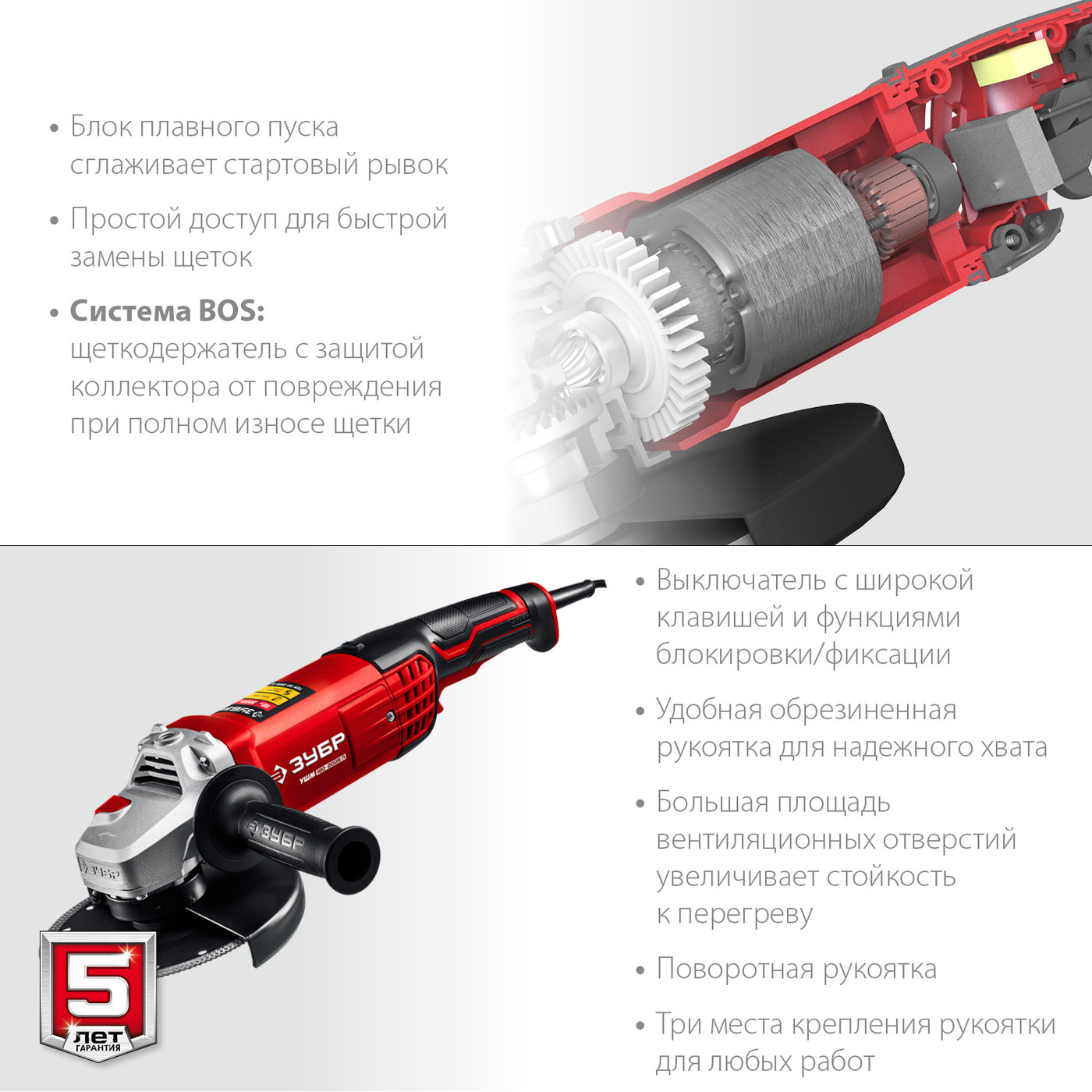 На электроинструменты и бензотехнику «ЗУБР» действует расширенная 5-летняя гарантия. Служба качества контролирует процесс производства на каждом этапе.