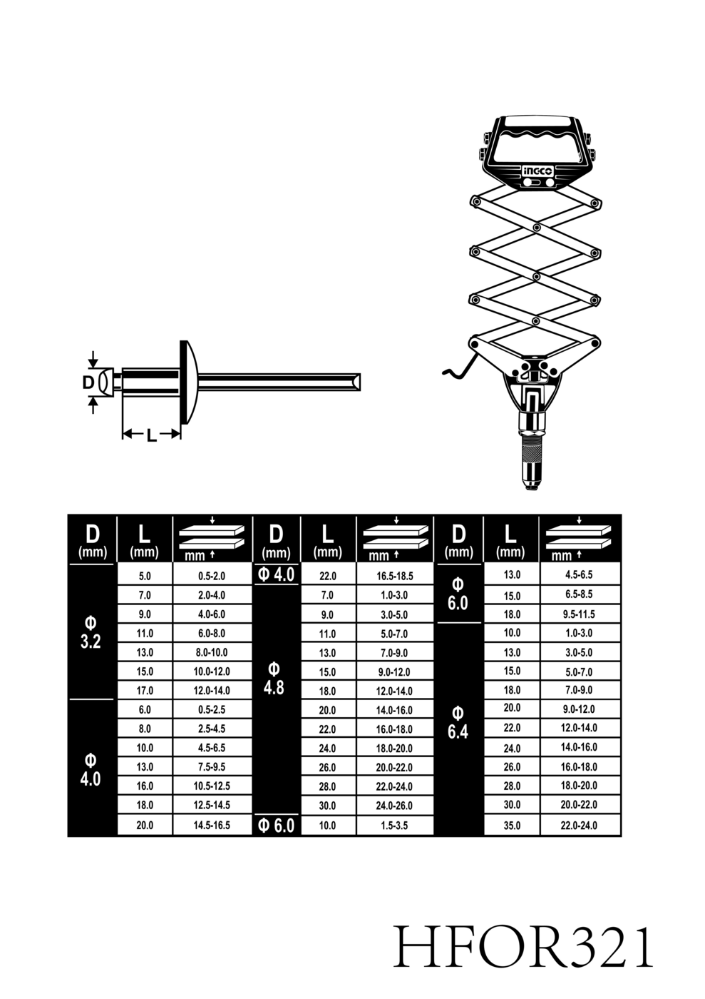 Заклепочник гармошка 815 мм INGCO HFOR321 INDUSTRIAL используется для скрепления различных поверхностей между собой стальными или алюминиевыми заклепками.